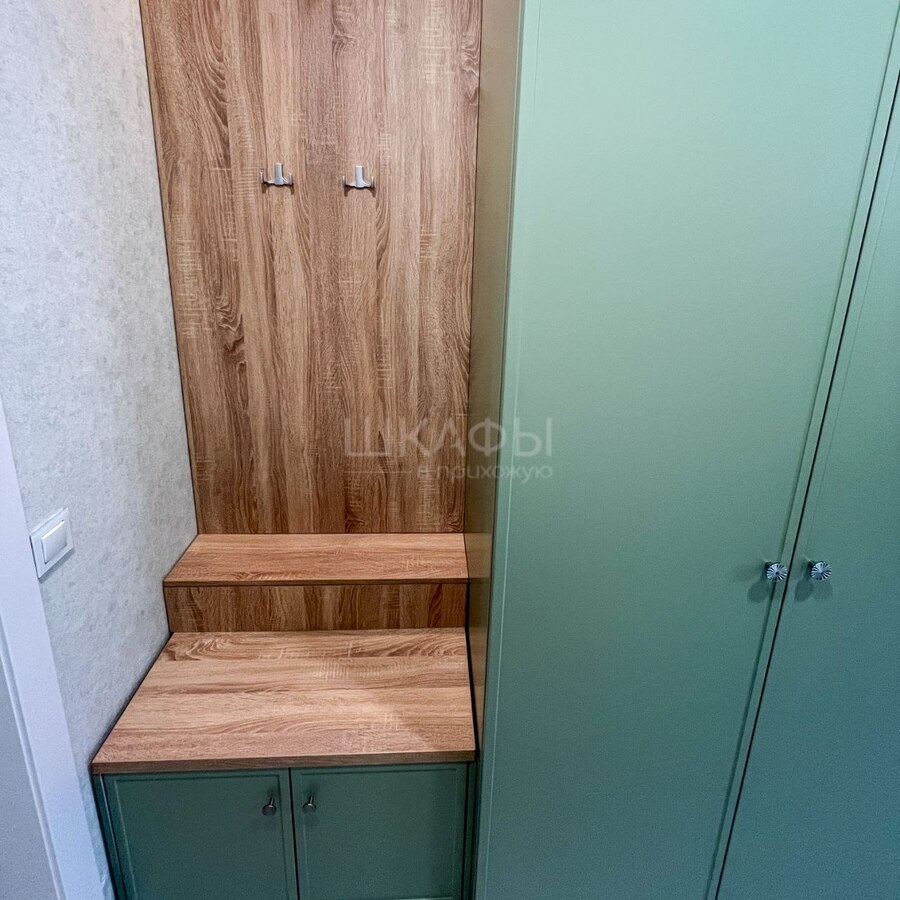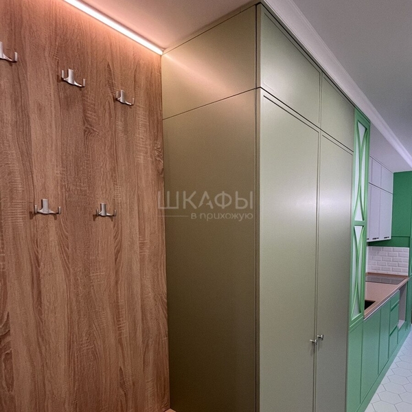 Прихожая в скандинавском стиле по ул. Руставели. Встроенный шкаф в модном зелёном цвете и с теплой текстурой дерева обеспечивает максимальное хранение и эстетику