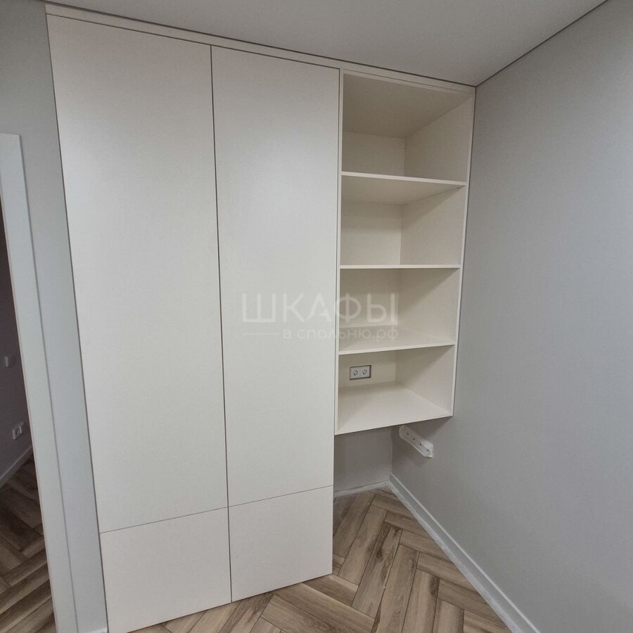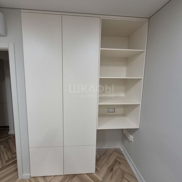 Шкаф с открытым стеллажом по ул. Пролетарская, Королёв. Минималистичный и современный, выполнен в контрастных, но гармоничных оттенках: матовый белый и светлое дерево
