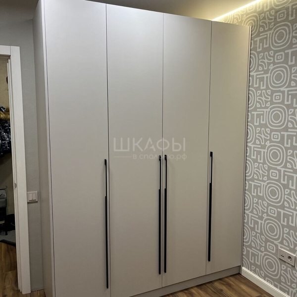 Четырехдверный распашной шкаф, Дмитровское шоссе. Минималистичное сочетание светлых фасадов и контрастных черных ручек-профилей, создающее строгий монохромный образ