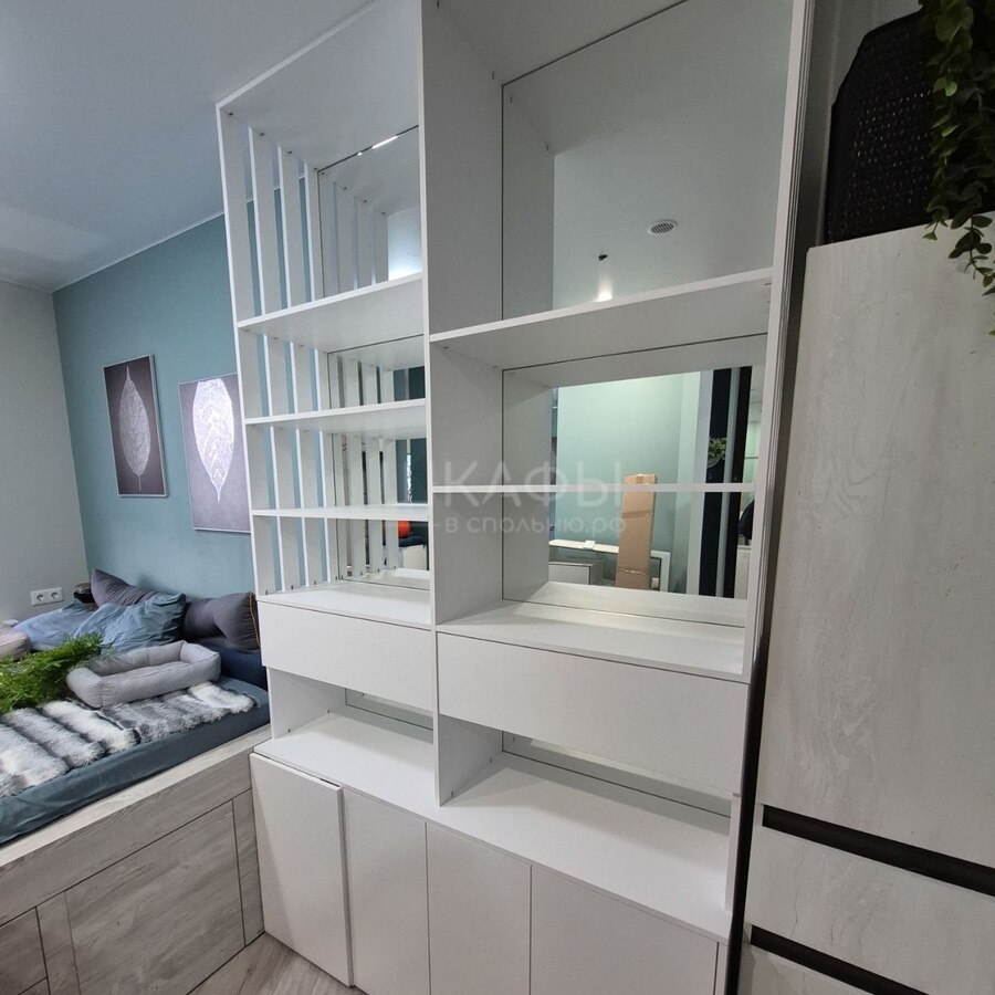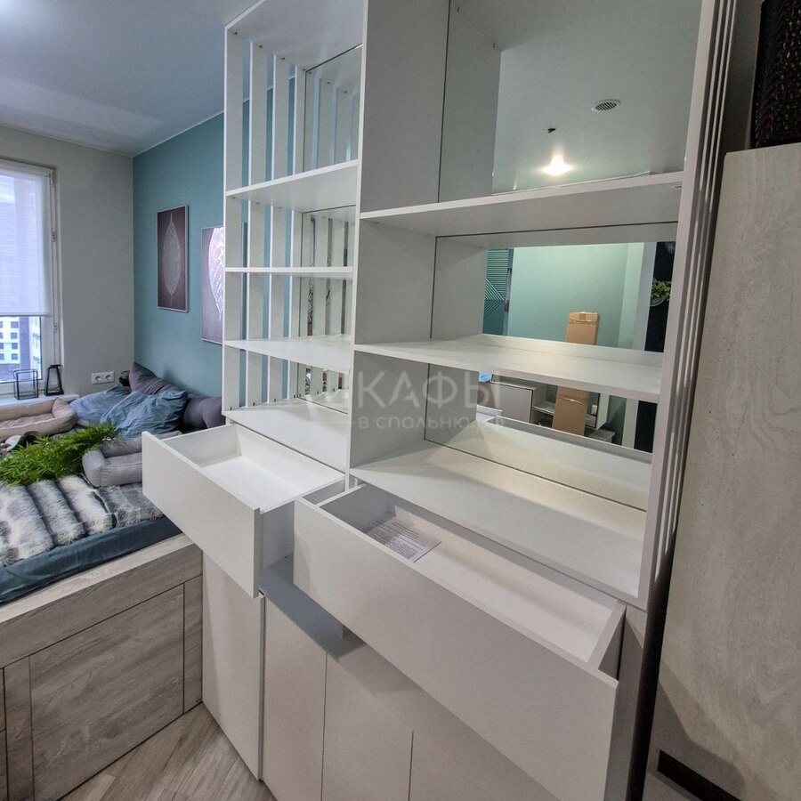 Шкаф-перегородка, Берёзовая аллея. Сочетание открытых полок для декора и закрытых ящиков для личных вещей. Общее число запросов