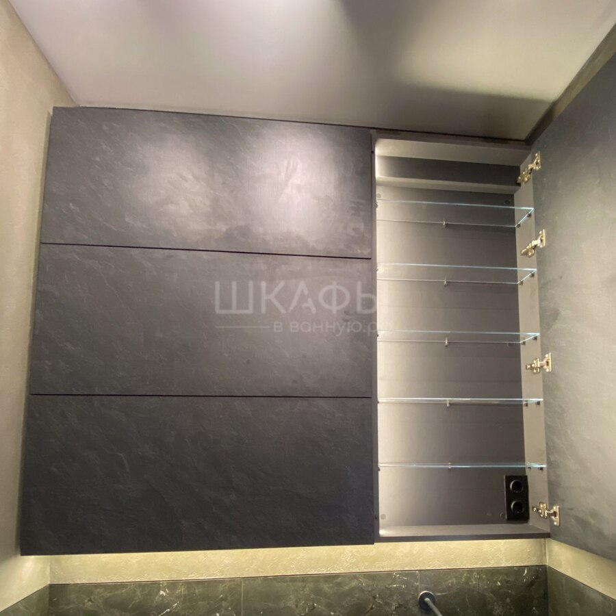 Зеркальный шкаф для коммуникаций с открытой полкой и встроенной подсветкой. Система открывания push-to-open