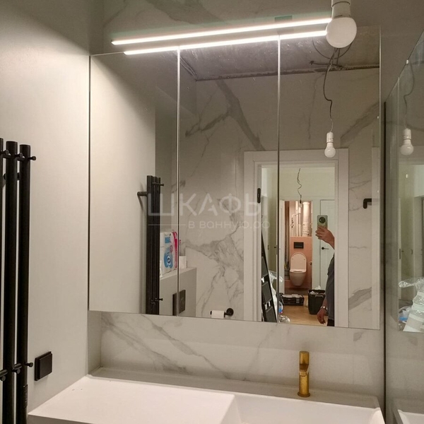 Зеркальный шкаф в ванную с подсветкой по ул. Новаторов. Предназначен для скрытия коммуникаций, при этом оставляя место для хранения